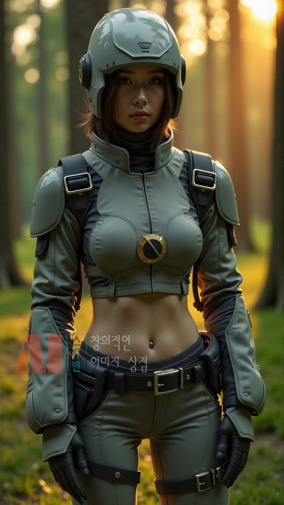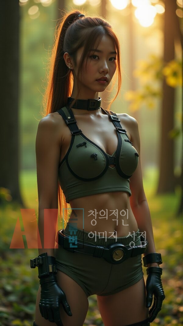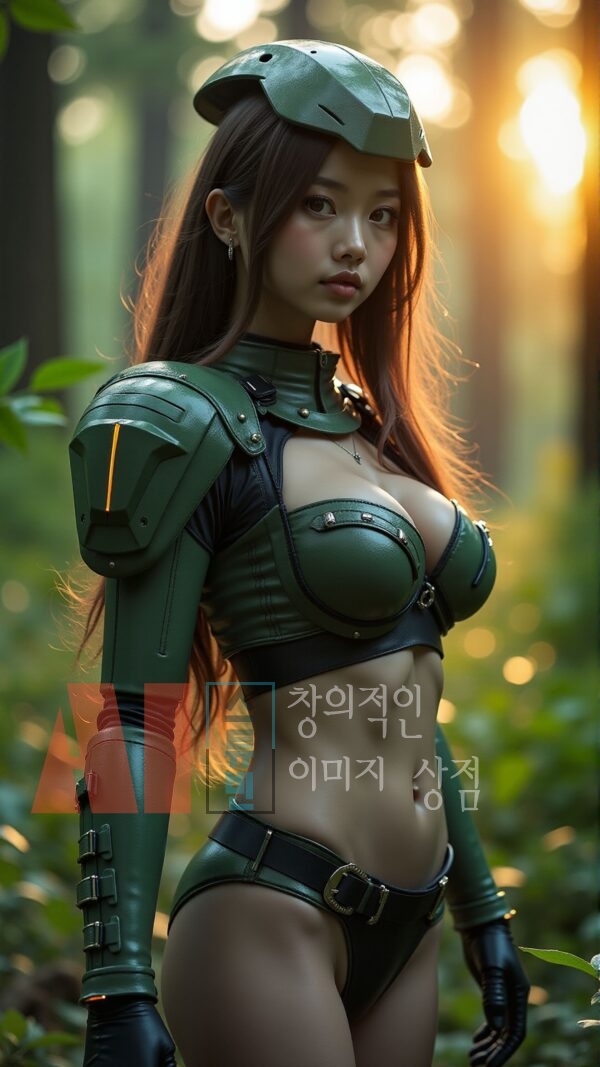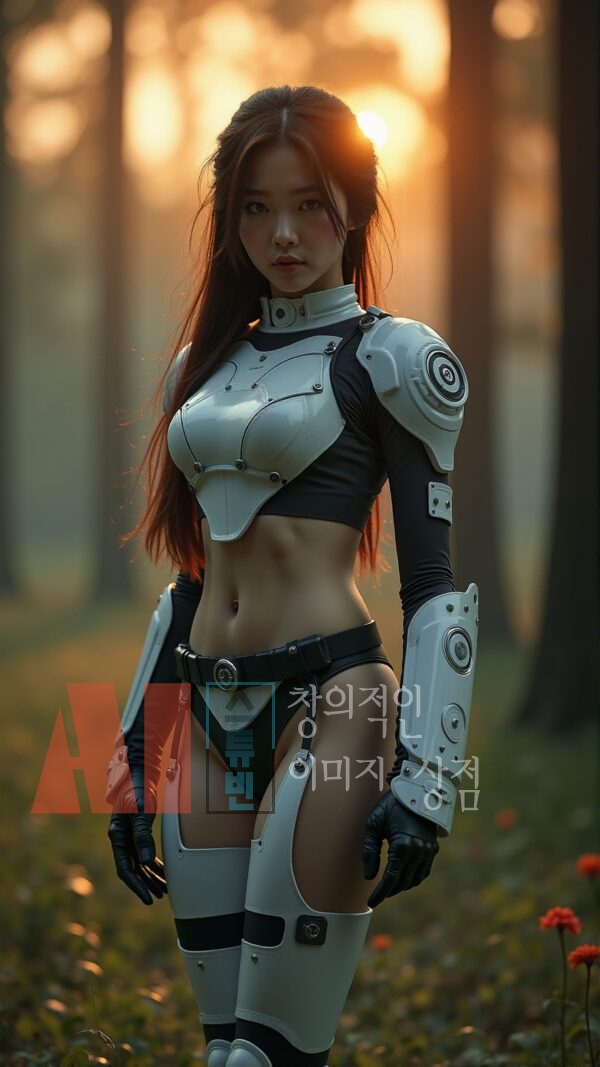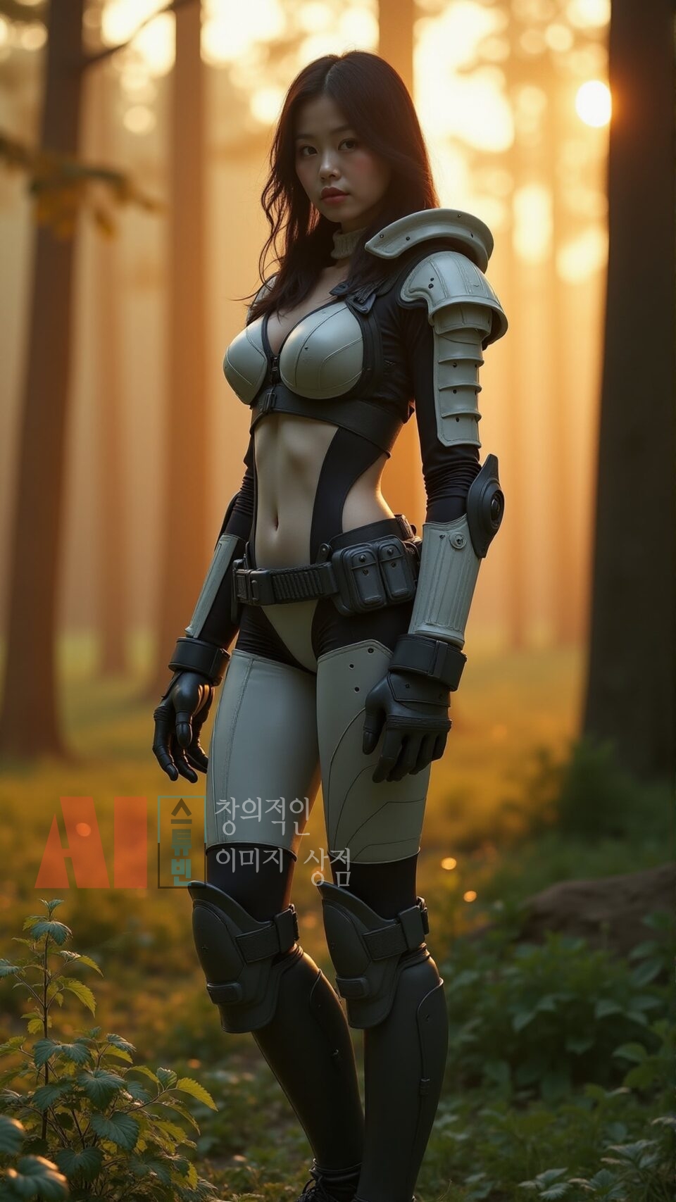 • 자연 vs 기술 대비: 숲속 석양과 미래형 장비의 대비로 강렬한 시각적 긴장감 형성