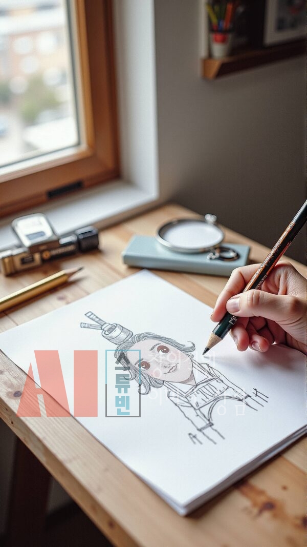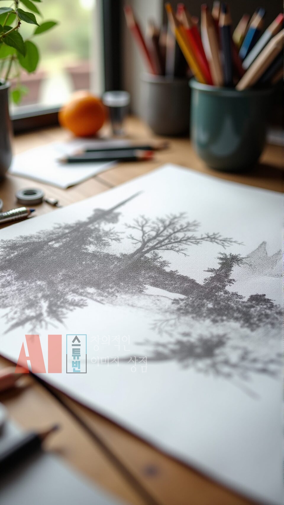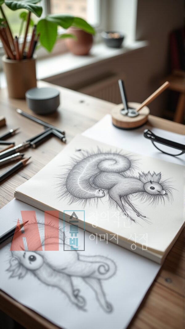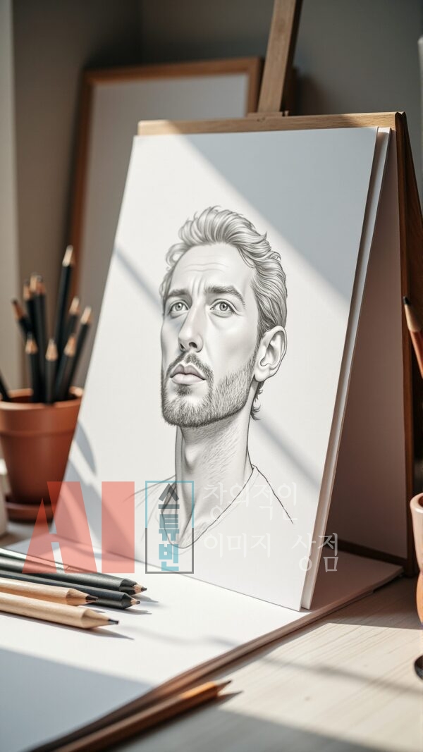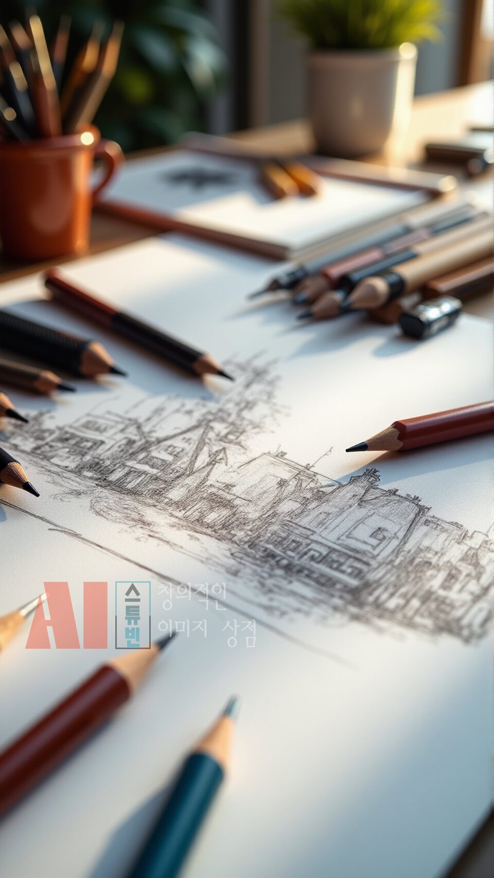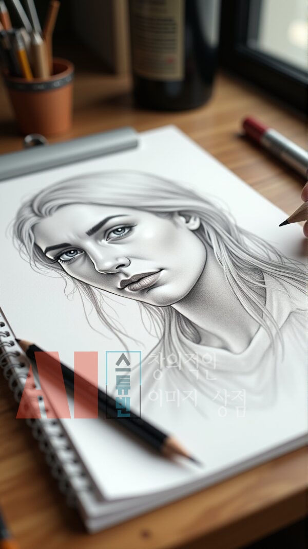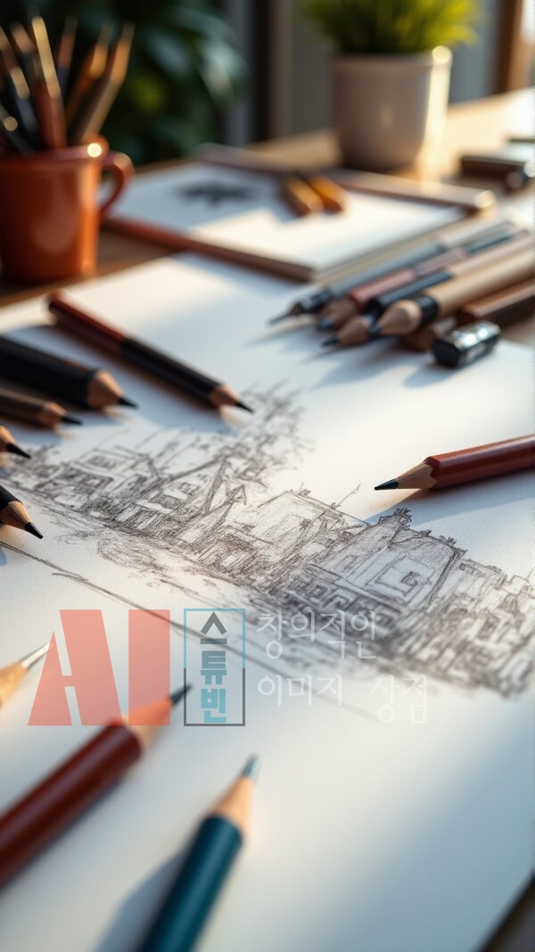 - 실제 작업 공간 연출: 연필, 색연필, 스케치북, 종이 등 드로잉 도구를 사실적으로 구성
