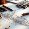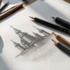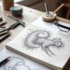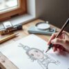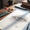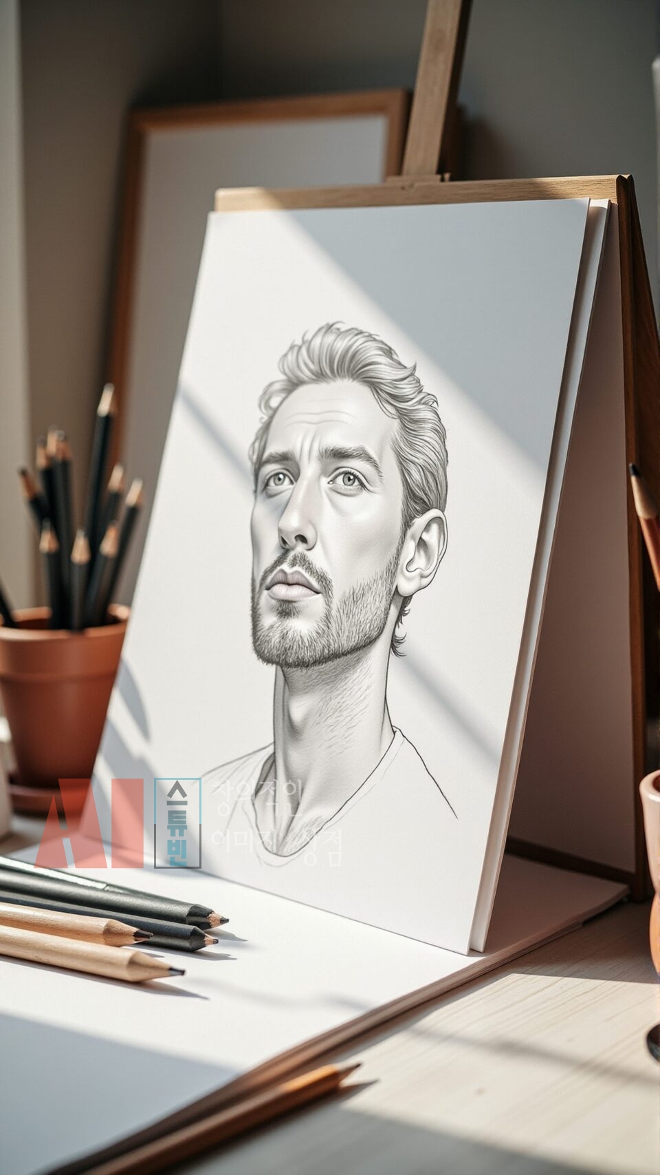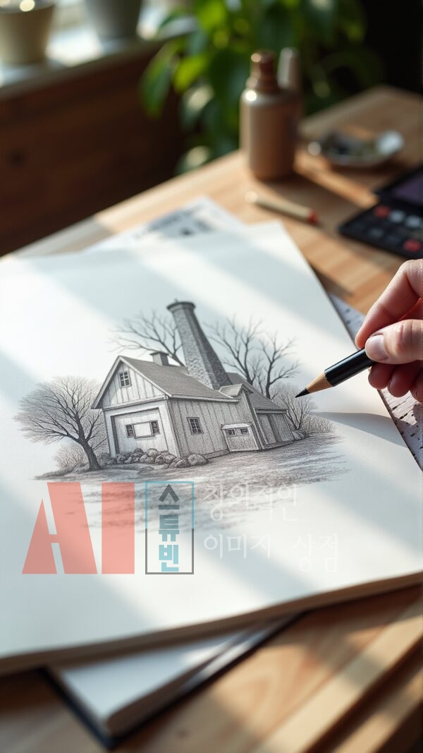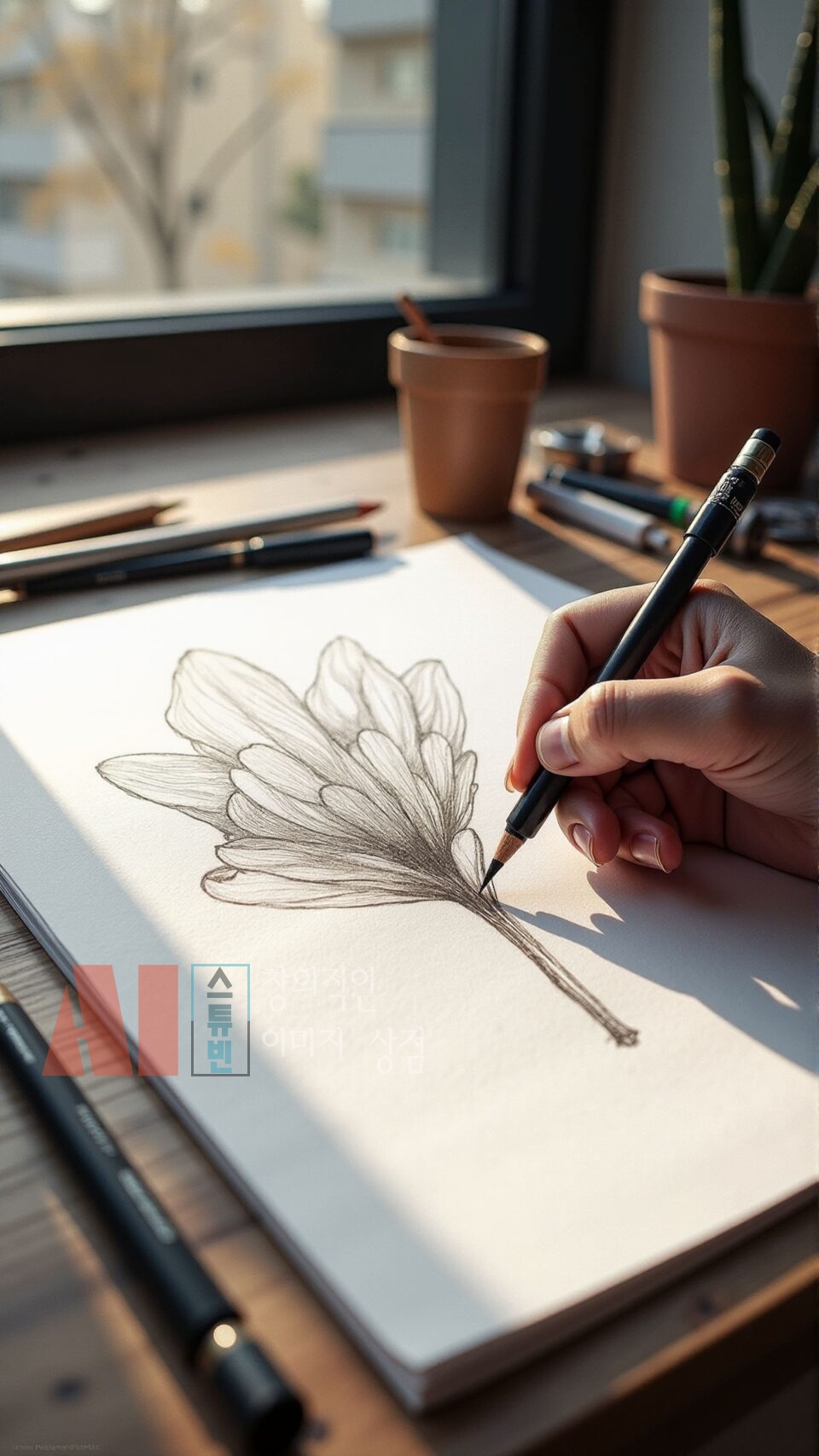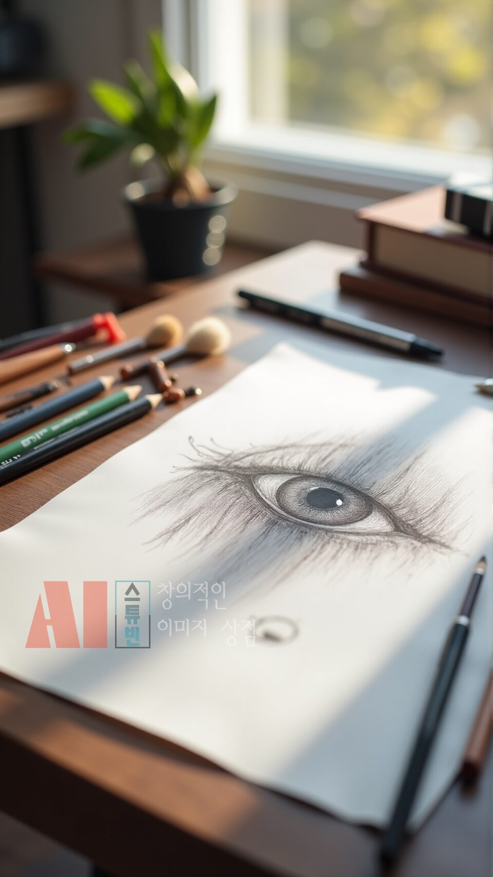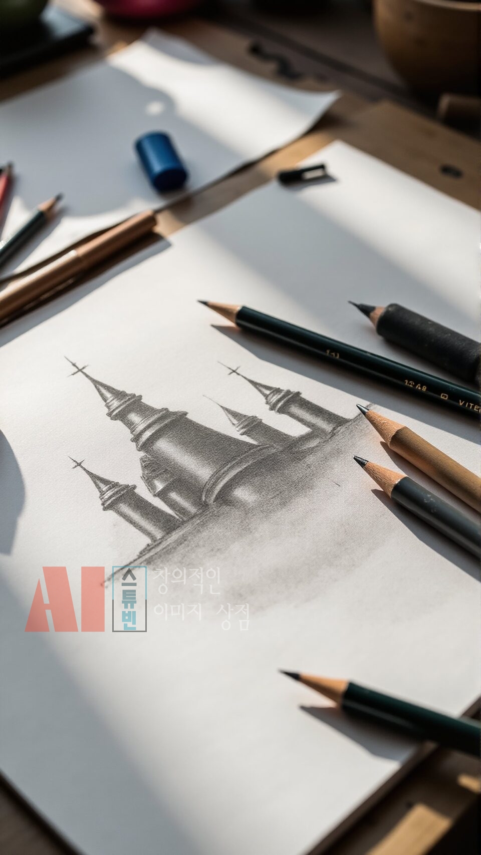 - 실제 작업 공간 연출: 연필, 색연필, 스케치북, 종이 등 드로잉 도구를 사실적으로 구성